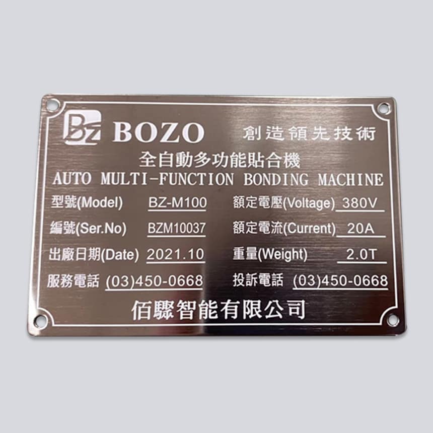 用於機械、電器、家具等設備上,標示型號、規格、品牌資訊等,可作為產品標籤、品牌識別、說明牌使用。